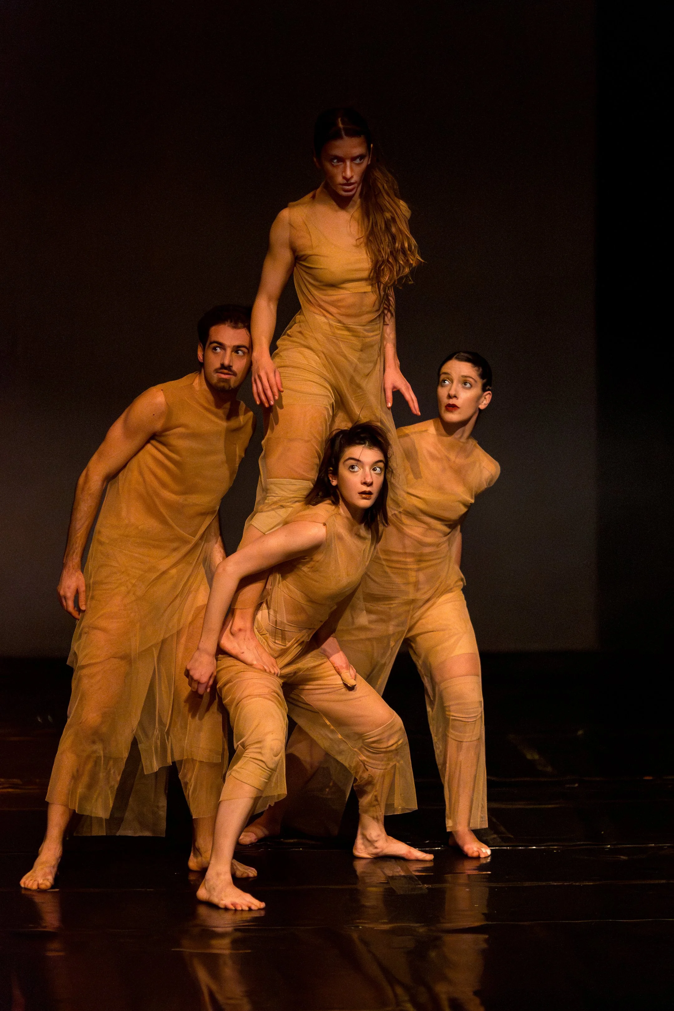 The elements of nature converse with a quartet of pulsating bodies on stage, composing a dance of contrasts and revealing an orchestrated primordial ritual. The bodies as molecules under examination start their journey from the scientist's microscope and are magnified by embodying the physical phenomena and their contrasts. An unfolding of nature, its creation and destruction.