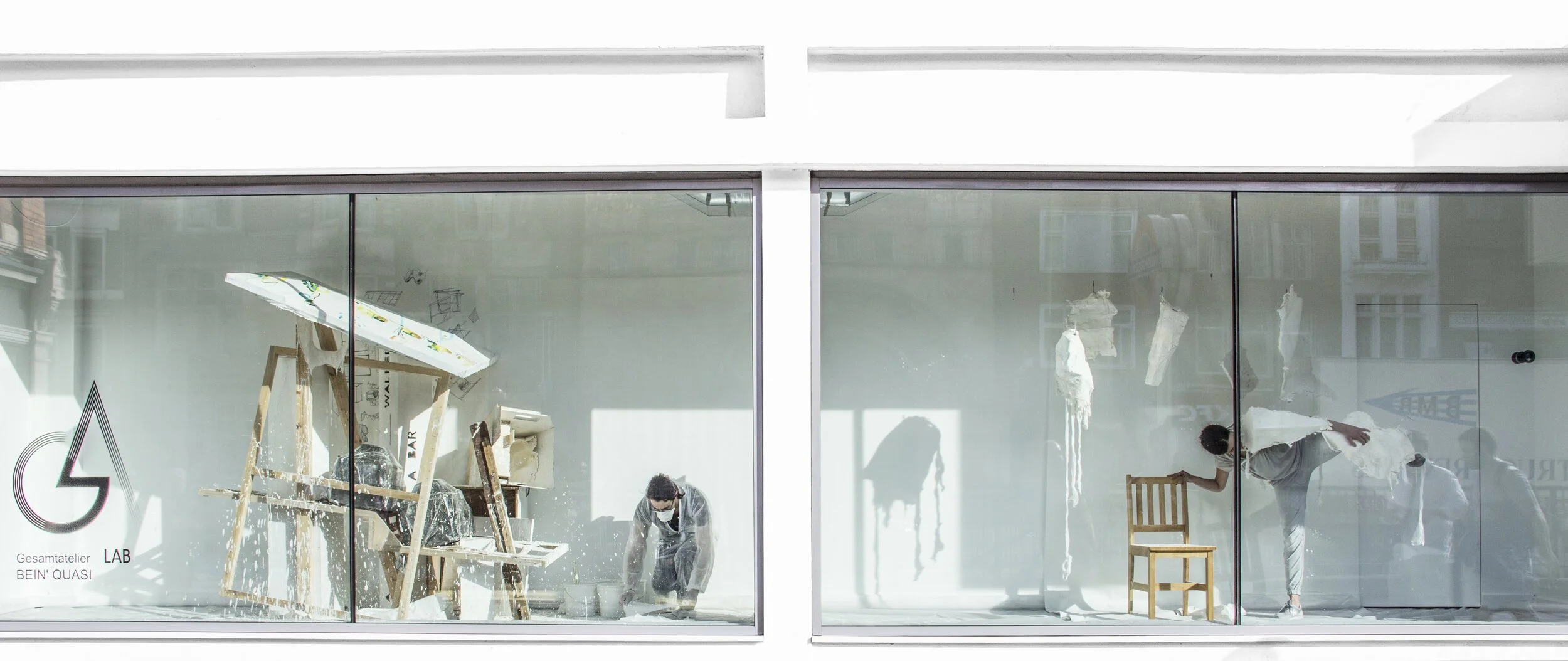 The project turns the spotlight to discarded objects found in storage rooms of art or performance venues: spolia which contain the stories of being the supporting roles for pieces of art. Our team transforms a windowfront into a laboratory: a process which transplants parts of the different objects onto the human body, which then performs them. Two laboratory operators/facilitators build up an installation, a library of objects, and create plaster gauze moulds off their shapes. The geometry and character of objects are encapsulated into the moulds, the negatives of their tangible and intangible contents. During the next phase of the metamorphosis performers are brought in the lab to become the specimens/hosts of the sculptural fragments. The object gradually transforms into quasi-object through the dynamics and attributes of the human body. The still nature of the object fades out, acquiring a performative one. The subject (the human), on the other hand, becomes the vessel of the object offering its body’s properties. The objects become the protagonists and their stories become the art piece.