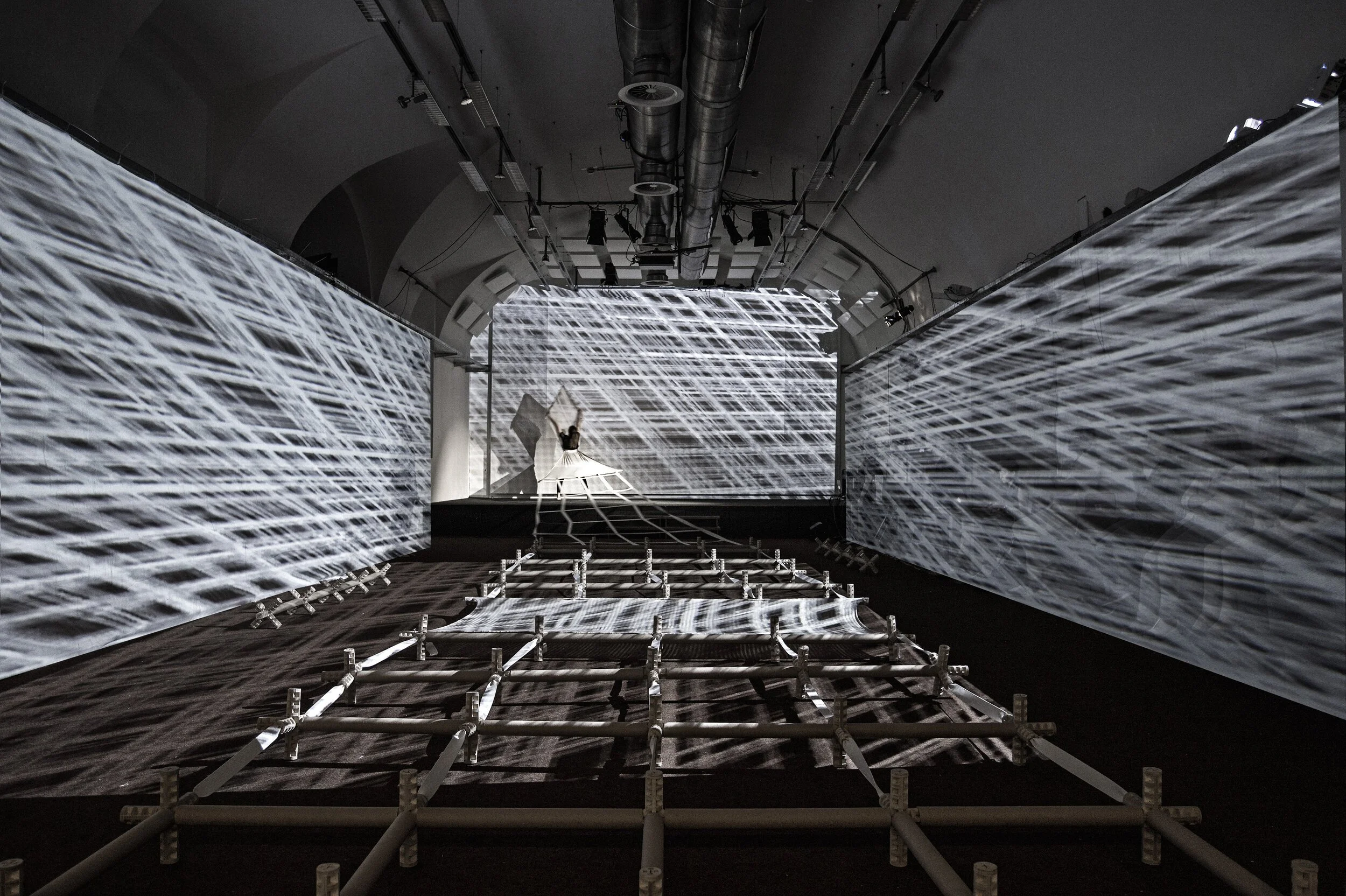 View of installation space: extended structure, video mapping, dancer